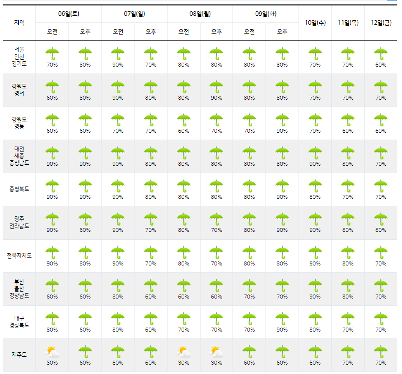 이번주 7월 6일(토) ~ 7월 12일(금) 전국 날씨는 긴 장마기간에 돌입해서, 비가 오는 지역이 많겠고, 특히, 매우 강하고 많은 비가 내릴 전망입니다. 지역에 따라 집중호우를 동반하는 곳도 있을것으로 보입니다. 다만, 7월 6일 오전과 7월 8일 제주도에는 비가 소강상태를 보이겠습니다.
