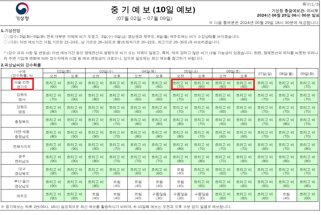 기상청 예보에 따르면, 7월 5일 ~ 7월 6일 양일간 비가 내릴 것으로 예측하고 있습니다.